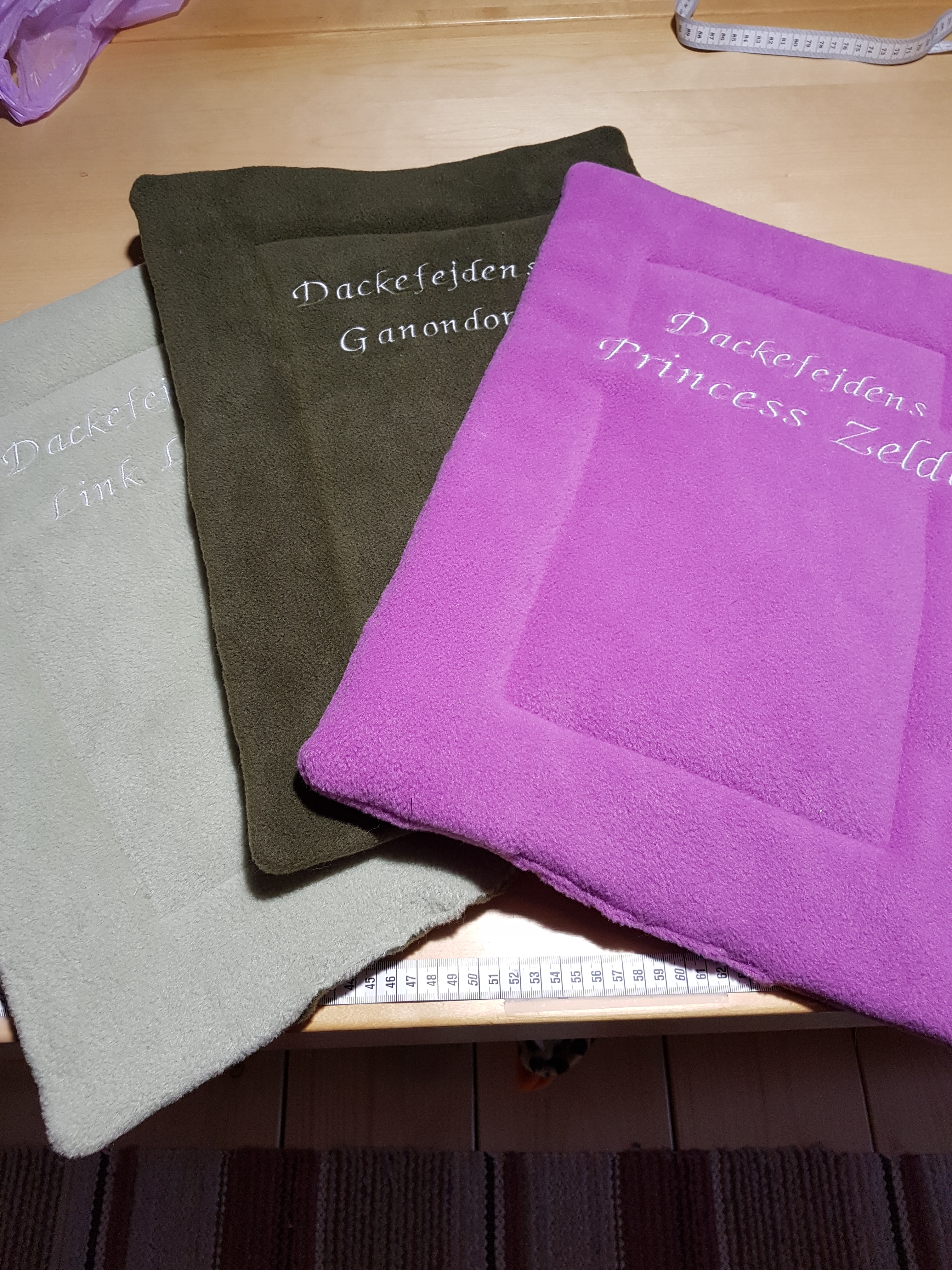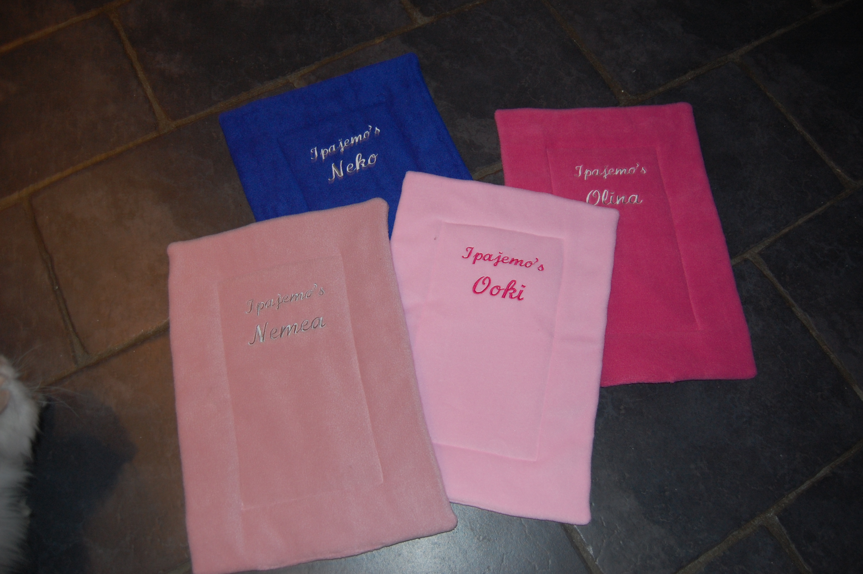Här exempel på dessa som är broderade med stamnamn och kattens namn.