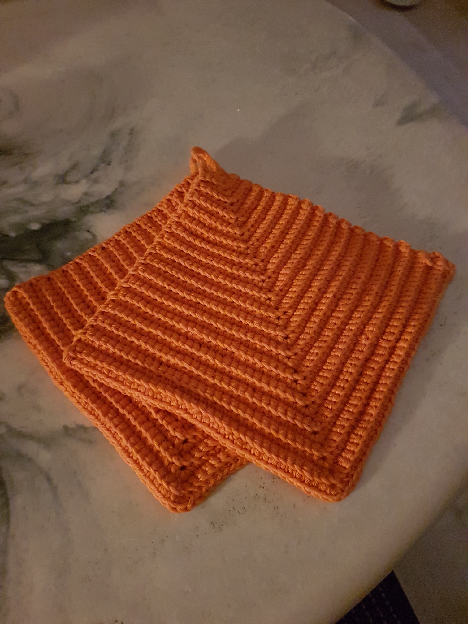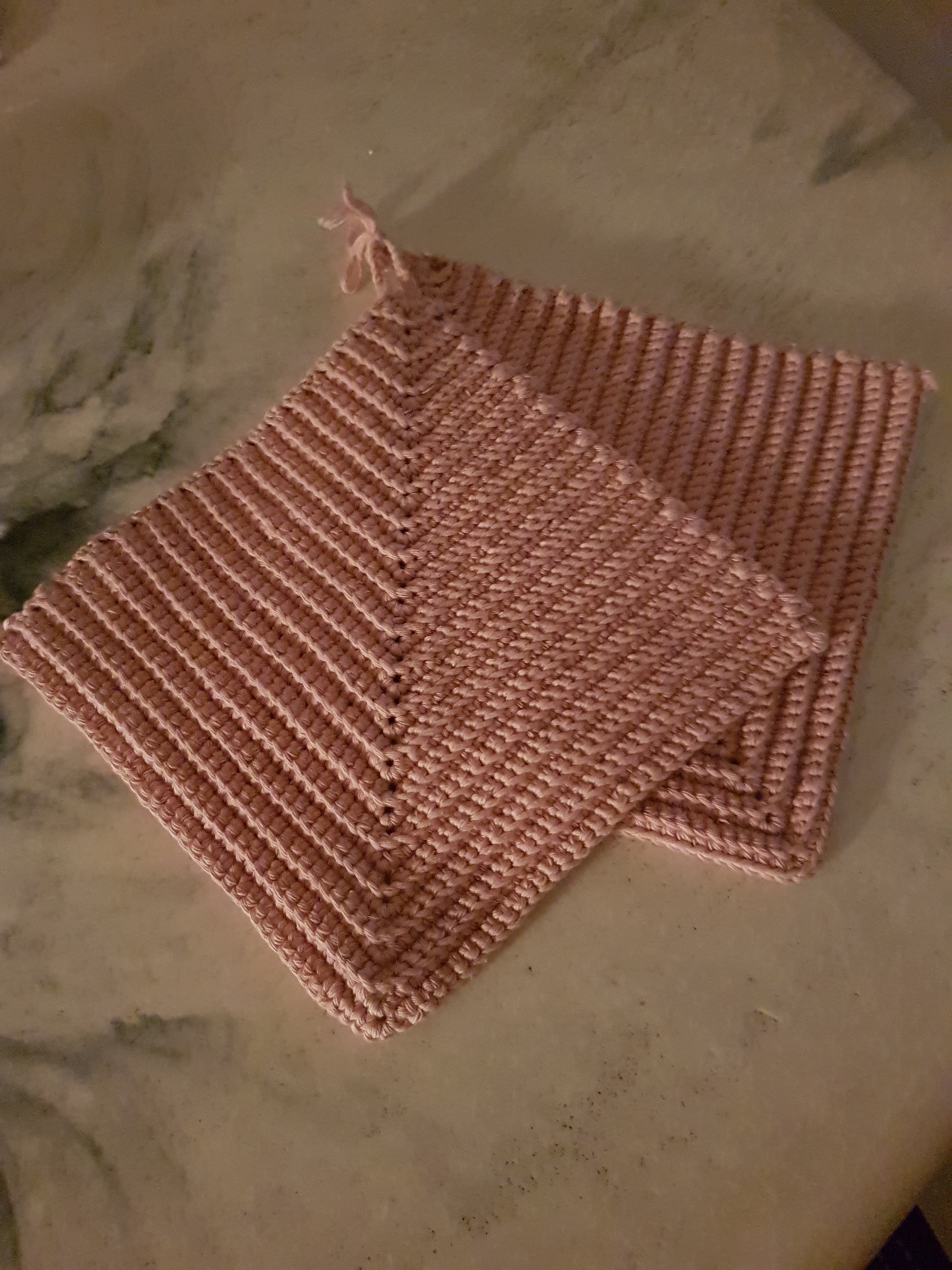 Jag virkar upp grytlappar i bomullsgarn i härliga färger.